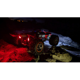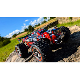 Der DF06 PRO MINI aus der Advanced Line von DF Models ist ein Brushless Truck im Massstab 1:18. Das Modell kommt fahrfertig aufgebaut (RTR) mit Fernsteuerung, Akku (LiPo Power) und Ladegerät (USB-Ladekabel). Der DF06 PRO MINI ist ein 4WD Truck mit einem 5000kv Brushless Power-Motor und einer leistungsstarken Reglereinheit ausgestattet. Der 7,4 Volt LiPo-Akku liefert die nötige Leistung für den kraftvollen Antrieb. Spitzengeschwindigkeiten von bis zu 60 km/h sind somit möglich. Der Truck ist wie sein Bruder, der DF06 (Nr.3122) mit allen nur erdenklichen Tuningteilen „out oft he box“ ausgestattet. Dämpfer mit Aluminiumteilen, Metall-Antriebswellen, Metall-CVD Kardans vorne, Aluminium Querlenkerhalterungen, Spezial-Servo-Saver, gekapseltes Getriebe sowie Kugellager lassen kaum Tuning-Wünsche mehr offen! In der mittels Schnellverschluß befestigten Karosserie ist eine LED Beleuchtung integriert, die Fahrten in der Nacht/ Dämmerung zum Highlight machen.